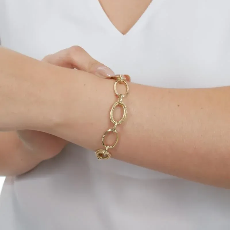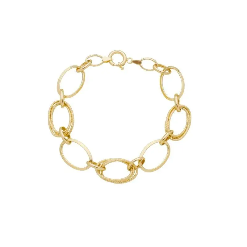 A Pulseira 2 Aros Elo Oval Elo Torcido Entre 1 Aro Ouro Amarelo 18K, com 19 cm 12.2 mm é uma pulseira em ouro 18K com malha 2 Aros Elo Oval Elo Torcido entre 1 Aro, ideal para quem busca sofisticação e brilho no dia a dia. Perfeita para usar sozinha ou combinada com outras pulseiras, é uma ótima opção para quem procura pulseira de ouro 18K de alta qualidade.