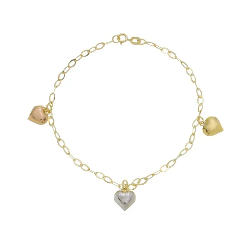 A Pulseira Elo Navete Com Três Corações Tricolor Ouro Tricolor 18K é uma pulseira em ouro 18K com malha Elo Navete com Três Corações Tricolor, ideal para quem busca sofisticação e brilho no dia a dia. Perfeita para usar sozinha ou combinada com outras pulseiras, é uma ótima opção para quem procura pulseira de ouro 18K de alta qualidade.