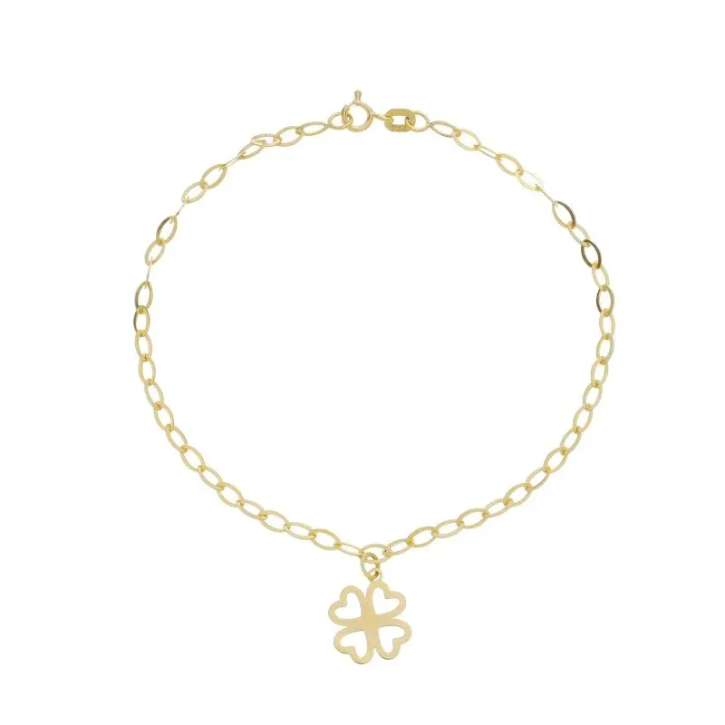A Pulseira Elo Navete Laminado Com Pingente Trevo Ouro Amarelo 18K, com 19 cm é uma pulseira em ouro 18K com malha Elo Navete Laminado com Pingente Trevo, ideal para quem busca sofisticação e brilho no dia a dia. Perfeita para usar sozinha ou combinada com outras pulseiras, é uma ótima opção para quem procura pulseira de ouro 18K de alta qualidade.