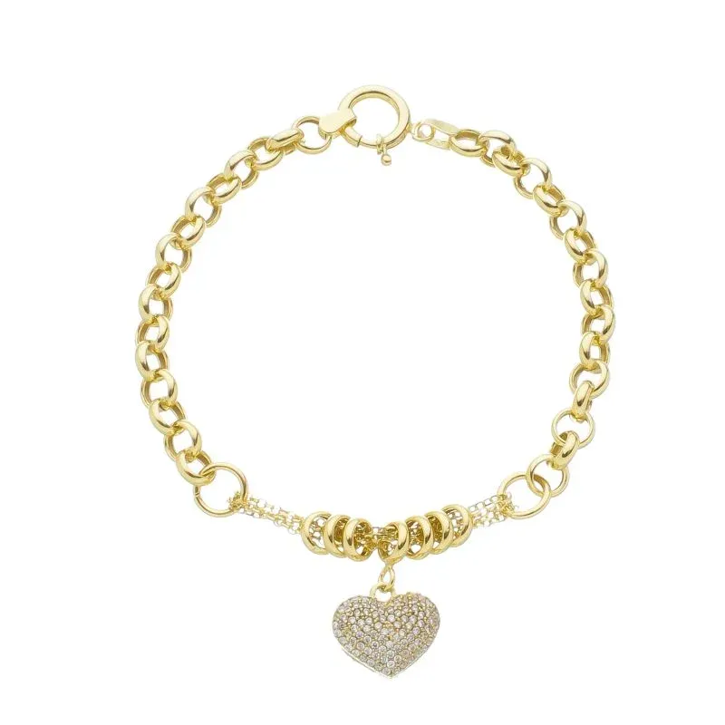 Pulseira Elo Português com Pingente Coração Duplo Cravejado de Zircônia Ouro Amarelo 18K